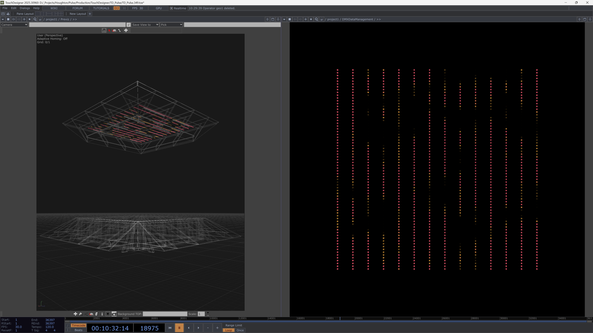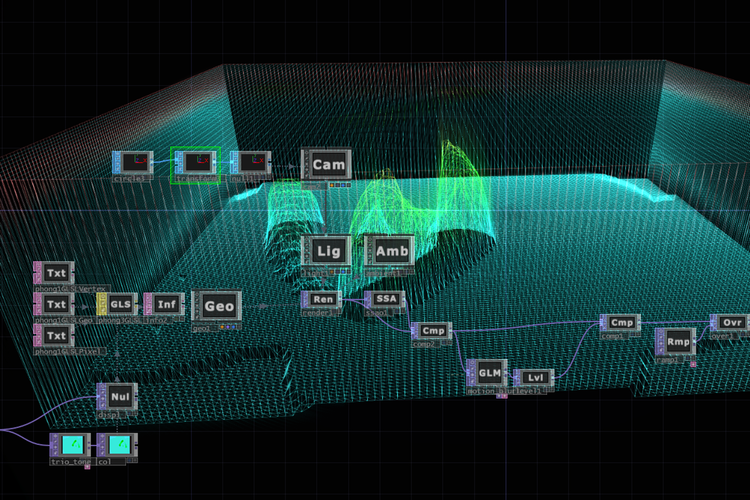 TouchDesigner functioned as the central show control environment, handling real-time audio analysis and signal mapping, procedural lighting generation and pixel mapping, as well as the sequencing and playback of spatial audio created using the L-Acoustics L-ISA system. The platform also managed synchronised Art-Net control, ensuring that light and vibration moved in harmony with the evolving soundscape to create a unified, immersive experience.