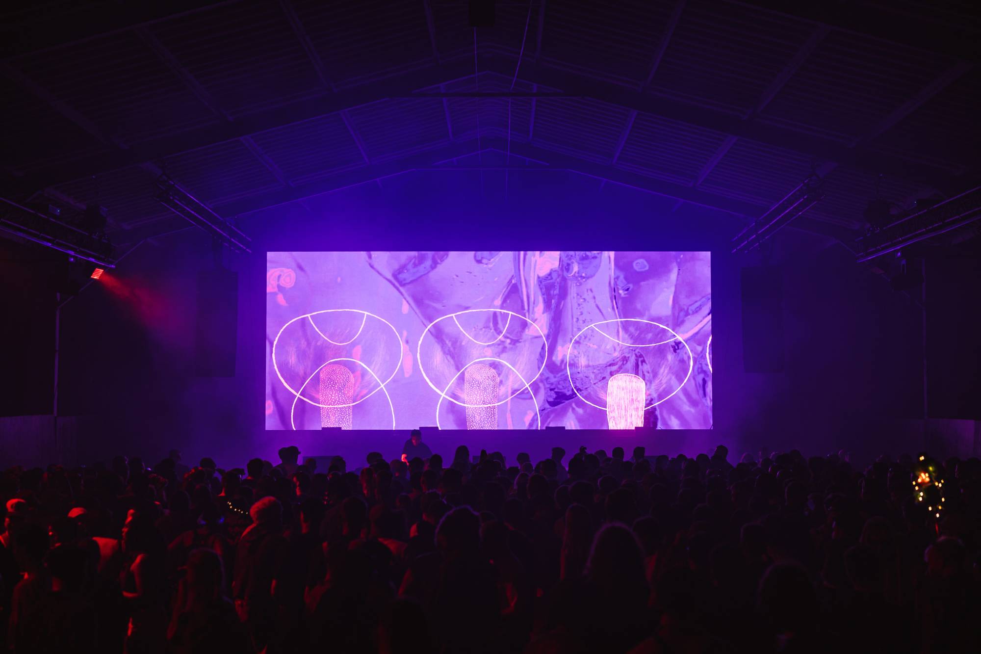 The assets were procedurally generated in TouchDesigner using a bespoke pipeline that ingested video, photography, and scanned artworks from Craig’s personal archive. Hupfau brought these elements to life through 2D animation, which were then composited, treated with generative post effects, and rendered into a diverse visual library. The system automated the entire process—producing a rich catalogue of reactive content for VJs to use across multiple stages during the festival.