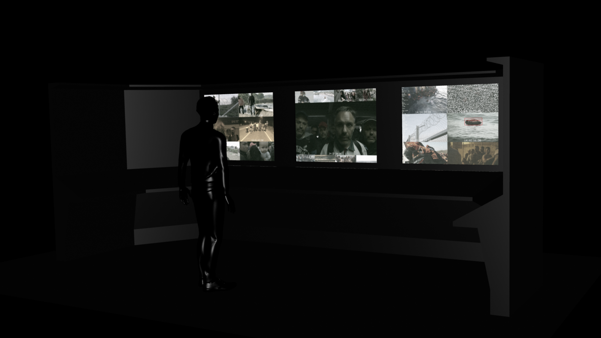 Air Traffic Control investigates video surveillance, synthetic media, and the politics of migration. Designed and engineered by Oliver Ellmers at Dimension Studio for Terminal 1 at Glastonbury Festival 2025, the work begins by capturing each visitor at a border-control checkpoint. Their face is routed through a custom AI face-swap system, and later - without warning - they encounter a CCTV wall where their likeness appears, seamlessly composited into real scenes of migrants under pressure.