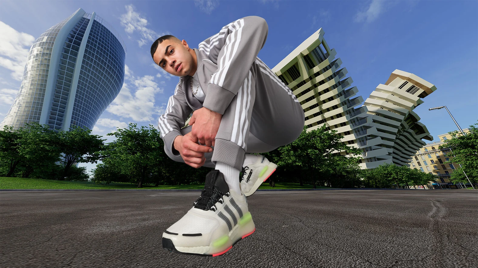 adidas Originals and Foot Locker enlisted three rising European rappers—Nahir from France, Sainté from the UK, and Sacky from Italy—to collaborate on a cypher set in a futuristic cityscape. The musicians perform in a digitally augmented environment, with viewers able to project the cypher around them wherever they tune in. The campaign also features the rappers sporting the new trainers in a digitally distorted version of their home cities, blending fashion and music in a boundary-pushing digital experience.