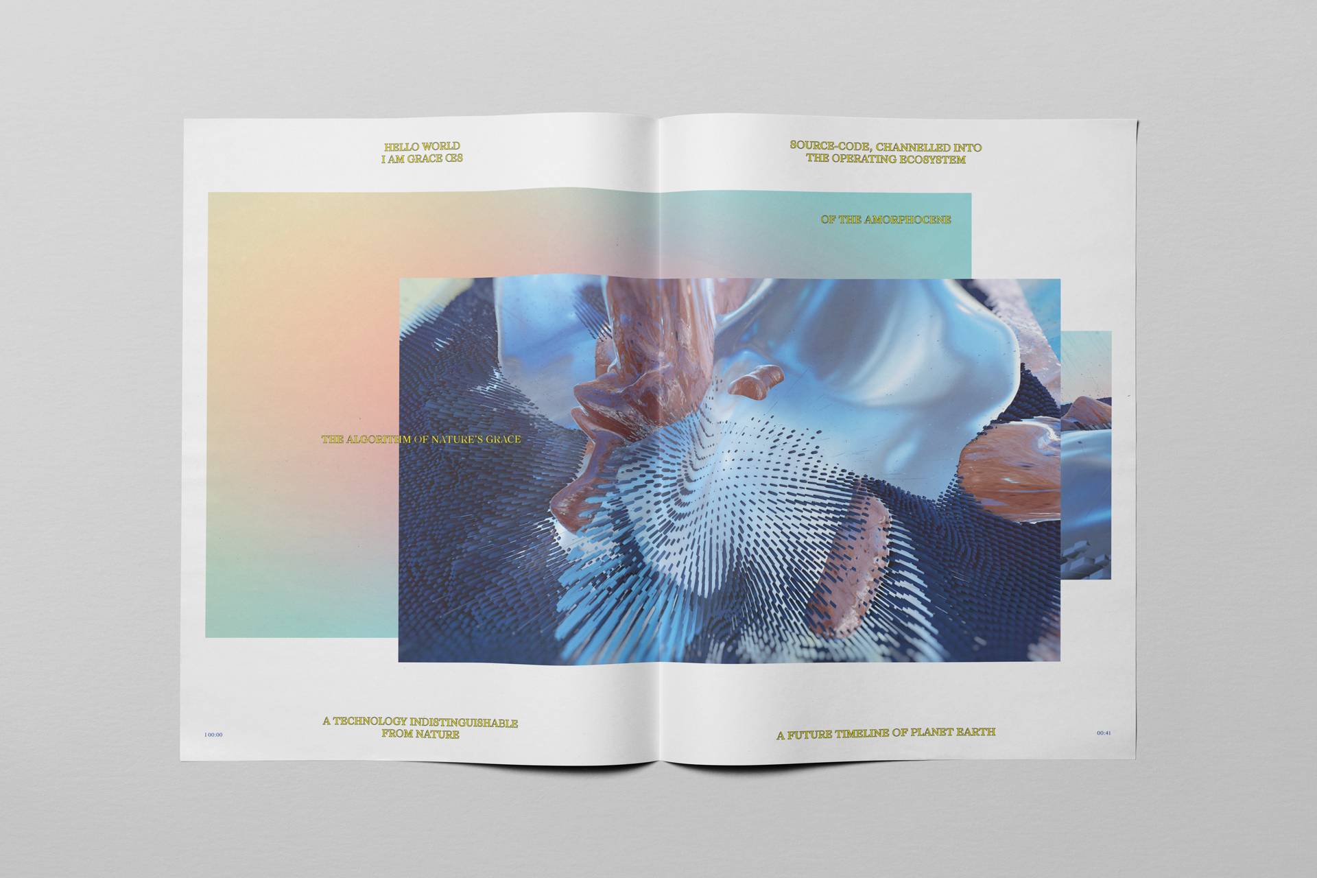GRACE ŒS (BETA) is an immersive audio-visual installation that transports visitors into a speculative future world—the AMORPHOCENE. Set in a post-Anthropocentric era, this imagined future envisions humans as shapeshifters who have merged with the more-than-human world, creating technologies that are indistinguishable from nature itself.