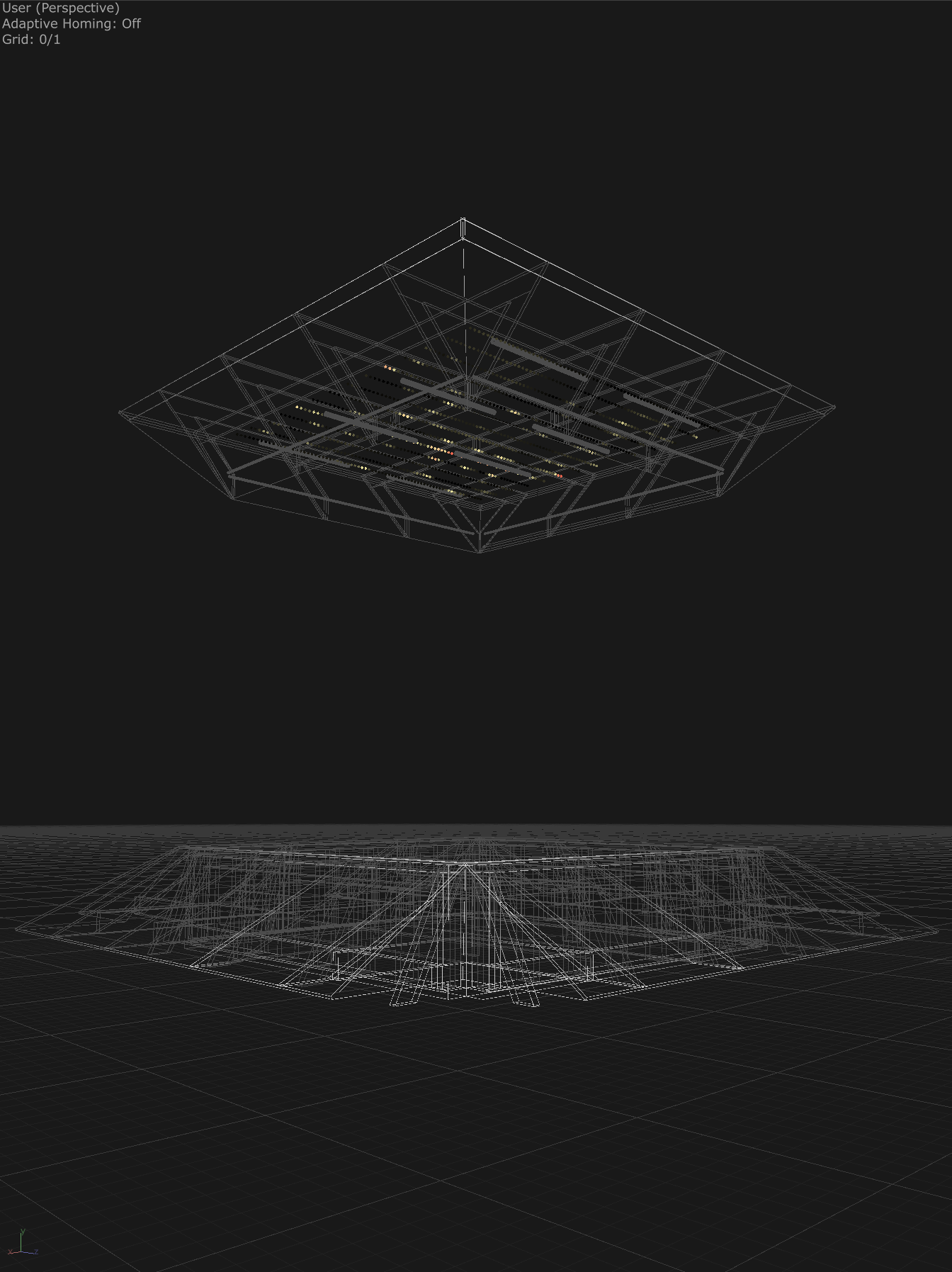 As Lighting Designer and Technical Systems Engineer, Oliver Ellmers was responsible for the real-time integration of the visual and sonic components. Using TouchDesigner, he created a custom interactive control system that ingested 3D spatialised audio composed by Kevin Pollard, and translated it into procedural lighting patterns mapped across the suspended LED canopy. The system analysed live audio streams from the L-Acoustics spatial speaker array, driving both lighting and haptic transducers embedded within the structure to create an enveloping sensory field.